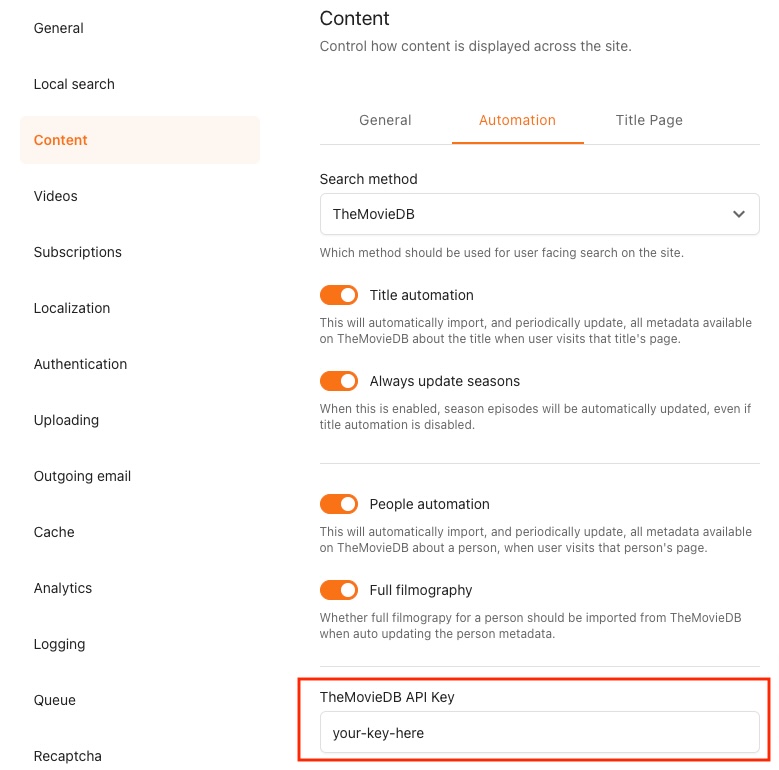 If you want to enable automation and and import movie and series data automatically, you will need to register for themoviedb API key and enter it in the settings page in admin area.